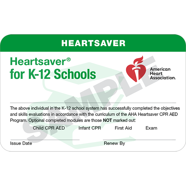 This option may be used for all Heartsaver courses taught in schools for kindergarten through 12th grade. This includes elementary, middle, junior, and high schools. Course completion cards may be issued to school students, faculty, and staff. “Faculty” refers to teachers and coaches; “staff” refers to an employee of a K-12 school or K-12 school system.